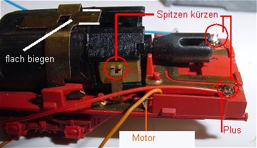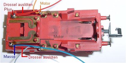 Im Tendergestell wird der Motor durch Verschieben der Halteklammer nach recht entnommen. Beide Drosseln werden ausgelötet. Die Motorfedern