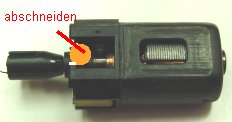 Der Motor wird nach Anlöten der Litzen wieder eingebaut. Dabei wird die Haltefeder am Ende, wo die Birne sitzt flach gebogen, die Motorfedern
