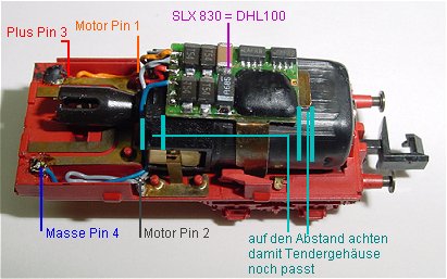 Hier ist der Decoder SLX830 bereits aufgeklebt. Es ist darauf zu achten, das der Abstand zur vorderen Motorkante und der zum hinteren