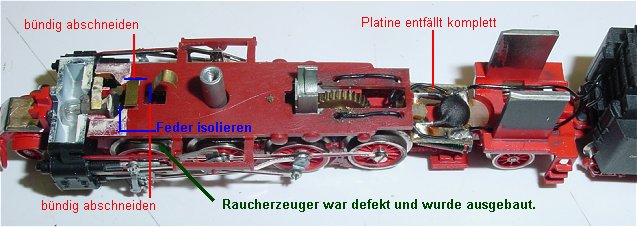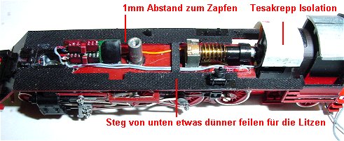 Motorlitzen und die Litze für die Tenderlampe darunter nach hinten verlegt werden können. Grund für das bündige Abschneiden der beiden Federn