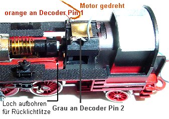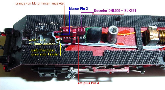 auf der Rückseite des Decoders angelötet. Pin 2 grau an Motor, Pin 3 blau von Masse, Pin 4 rot von Plus, Pin 5 weiß an Birne