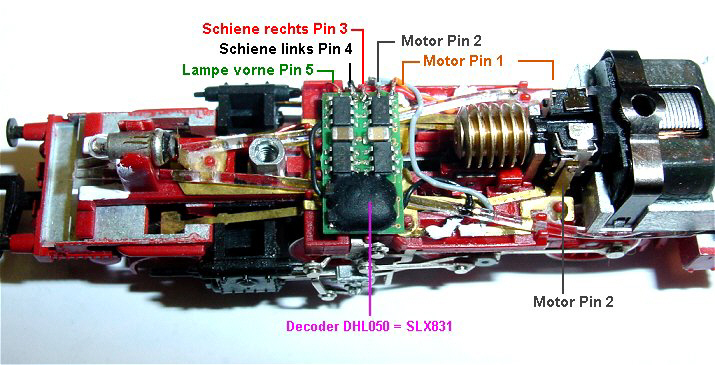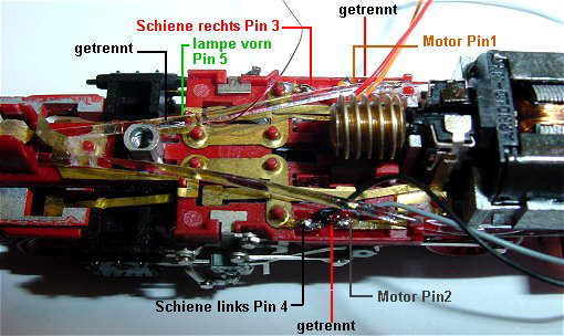 Der Decoder ist fixiert und verdrahtet. Pin 1 rechts oben orange an Motor oben im Bild. Pin 2 grau Motor unten. Pin 3 rot an Schiene rechts,