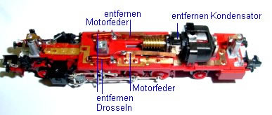 Beide Drosseln auslöten. Motorstromfedern aus den roten Plastiknippeln drücken und entfernen. Vier rote Plastiknippel der