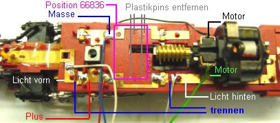 Darauf achten, dass die Lötfahnen des Decoders keinen Kontakt zu der Plus Leiterbahn bekommt. Ebenfalls dürfen nicht alle Originalkabel