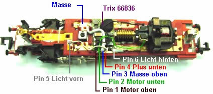 Der Trix 66836 ( baugleich DHL100 ) ist bereits quer eingeklebt und verdrahtet. Im Bild ist Pin 1 unten links.