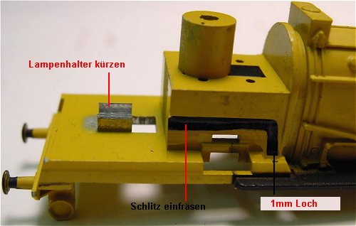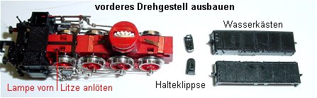 Drehgestell solange herausgenommen werden und die Lok an der Stelle auf dem Gleis mit einem Holzklötzchen abgestützt werden.