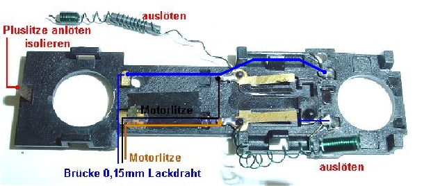An die beiden Motorstromfedern wird je eine Litze gelötet. Hier ist es wichtig, besonders dünne Litze zu nehmen, sonst passt später