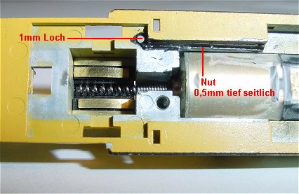 Mit einem Rundfräser ca. 0,8mm wird eine kleine Nut entlang der Innenwand gefräst und ein 1mm Loch exakt an der im Bild sichtbaren Stelle