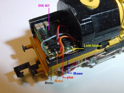 Der DHL161 ist eingeklebt. Pin 1 grau Motor, Pin 2 orange Motor, Pin 3 rot plus, Pin 4 Kupferlackdraht Masse, Pin 5 Licht vorne frei