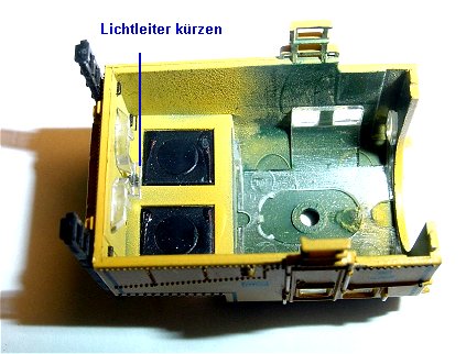 Der Lichtleiter muß an dem innen vorstehenden Pin bis auf 0,5mm gekürzt werden, sonst passt das Gehäuse nicht mehr drauf.