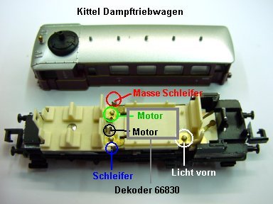 rot / blau, sowie die Motorfederbleche, grün / schwarz. Auf den Boden wird ein Blech, ca. 1mm rundum größer als der Decoder zur