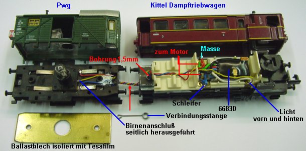 Kupplungsplättchen wieder aufgeklippst. Ballastblech vorsichtshalber mit Tesafilm gegen die Stromfedern isolieren. Im Triebwagen entfällt