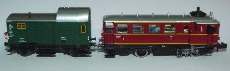 In diesem Falle zusätzlich mit festgekuppeltem Fleischmann Packwagen (8301) mit Innenbeleuchtung und Schlusslicht.