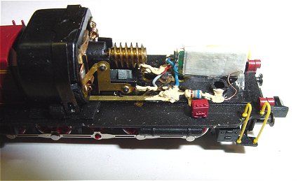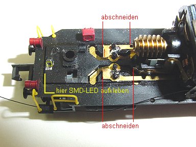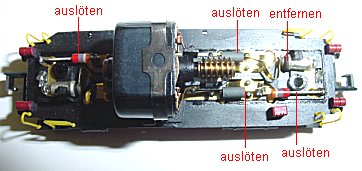Vorderteil: Die Entstörteile sind weg, die Messingleiterbahnen gekürzt, Der Boden vorn plangefräst. Nun werden vom Decoder die beiden