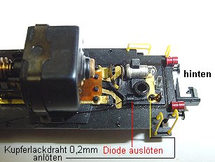 Der kurze Motorvorbau. Hier wird nach Auslöten der Lichtdiode ein Kupferlackdraht 0,2mm Stärke an die Lampenzuleitung gelötet und zwischen