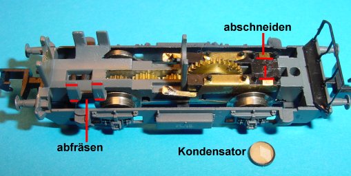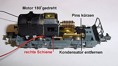 gekürzt damit kein Kurzschluss entsteht. Beide Stromfedern unter dem Motor werden verzinnt. Das Getriebe wird mit