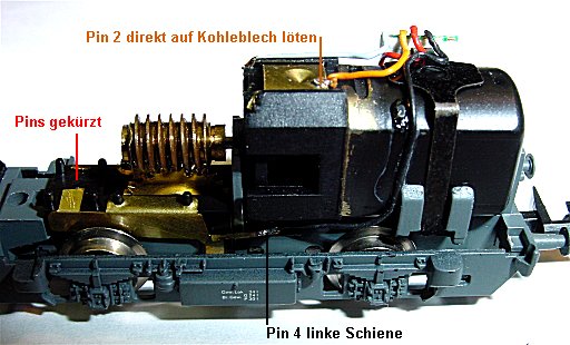 gelötet. Pin 2 orange an das Motorkohleblech oben. Pin 3 rot an Schiene rechts und Pin 4 schwarz an Schiene links.
