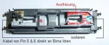 der Birnen gegen Plus unten. An die Birnen wird eine Litze direkt angelötet. Der rot markierte Teil wird ausgefräst,