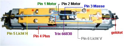 Hier ist der Decoder bereits aufgeklebt und verdrahtet. Anschlüsse links, Pin 1 ist oben.