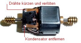 Der Kondensator an den Motoranschlüssen wird abgezwickt. Die beiden Drähte, welche als Scharnier für die Motorfedern