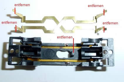 Noch einmal der Deutlichkeit halber die Leiterbahnen. Der Plastiknippel muss entfernt werden und an die beiden Stromabnehmer