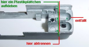 Kopfseite (grüner Strich im Bild) wir mit Sekundenkleber ein Plastikplättchen geklebt, ca. 0,3 mm dick.