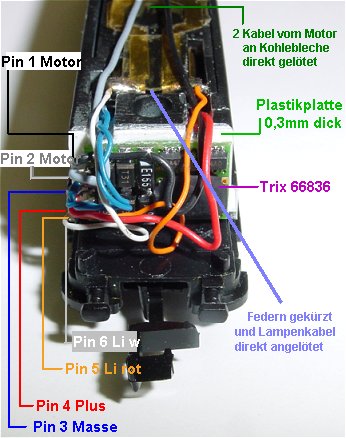 Der Trix 66836 = DHL100 ist auf das weiße Plastikplättchen als Isolierung aufgeklebt. Man sieht links die blaue Litze