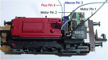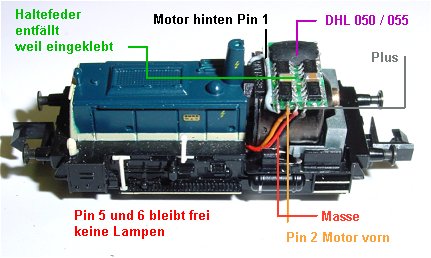 Motorvorbau ist wieder aufgesetzt und Decoder DHL050 auf die Plastikplättchen aufgeklebt. Die Plättchen sichern den