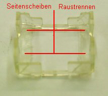 Der Scheibeneinsatz wird herausgenommen und die Seitenscheiben vorsichtig abgetrennt. Es bleiben die vorderen und hinteren
