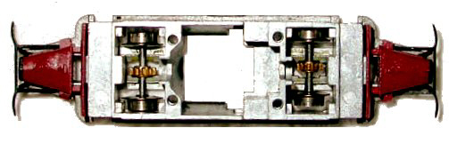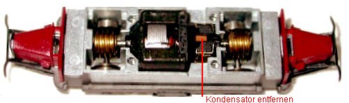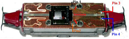 Achslager leicht ölen.Motor Kondensator (hier braun) herausnehmen, dazu muß mindestens ein Kohleblech ausgeklippst werden. Decoderunterseite mit Tesafilm isolieren und einlöten. Pin 1 oben, Pin 2 unten an den Motorfedern der Platine. Pin 3 rot oben rechts am Lötpunkt der Platine zu den Schleiffedern und Pin 4 blau unten am Lötpunkt der Radschleiffedern.