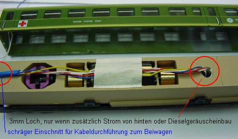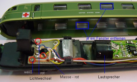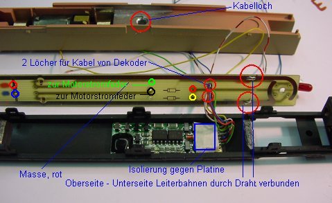unterbrochen, die Motorstromfedern bleiben erhalten. Masse rot zu den 2 Lampen bleibt. Auf den Dekoder vorn ein Stück