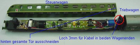 Umbau Steuerwagen: Im Steuerwagen die beiden Drehgestellkabel grün durch rot, und schwarz durch blau ersetzen.