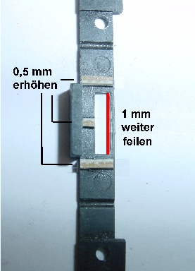 schleifen, wegen dem besseren Eingriff in die Fleischmann Zahnstange habe ich den Schlitz verbreitert.