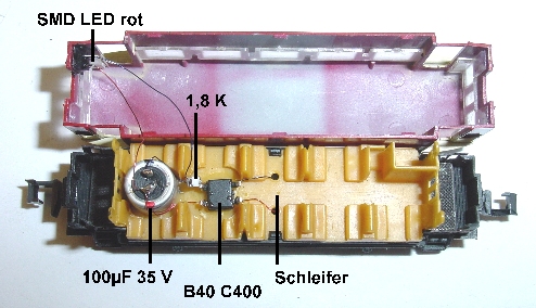 Der Anhänger bekommt ein (1) Schlusslicht rot. Dazu wird die Inneneinrichtung herausgenommen, zwei Stromabnehmerfedern über