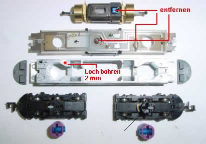 Die Drehgestelle werden herausgenommen. Dazu drückt man mit einer Pinzette die beiden schwarzen Stifte im Lila