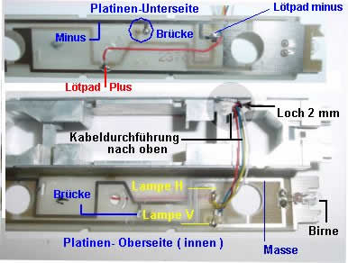 mittig fixiert und durch das gleiche Loch nach oben geführt. Auf der Oberseite der Platine wird an die beiden Lampen