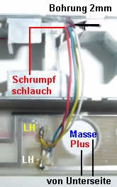 Diese Litzen müssen jetzt nach oben verlegt werden. Dazu bohrt man ein 2,5 mm Loch an der im Bild ersichtlichen Stelle von