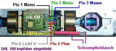 Lötpads besser löten kann, habe ich den Decoder DHL100 kopfüber aufgeklebt. In diem Fall ist Pin 1 des Decoders natürlich