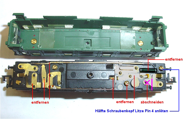 Die Drahtverbindung unten vom Drehgestell vorne zum Drehgestell hinten Plusstromabnahme der Radschleifer bleibt unverändert.