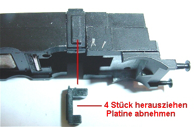 Um die Platinenplatte abnehmen zu können müssen vier Halteklippse herausgezogen werden.