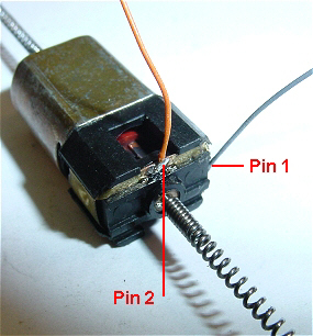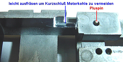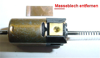 Am Motor wird oben eine Litze angelötet Pin 2, und seitlich am Kohleblech Pin 1.