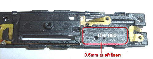 Die ausgebaute Platte wird an der rot umrandeten Stelle 0,5 mm tiefausgefräst. Man sieht die noch verbliebenen Messingfedern.