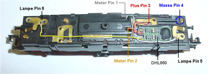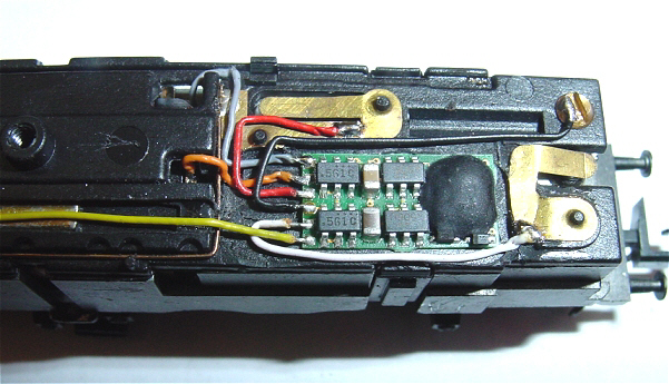 Der Decoder ist mit hauchdünnem Doppelklebeband aufgeklebt und verdrahtet. Man kann die gelbe Lichtleitung auch an der Nut