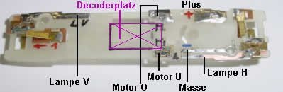Lila eingezeichnet ist der Platz für den Decoder DHL100. Die Platine ist von nicht benötigten Leiterbahnen frei. Geblieben