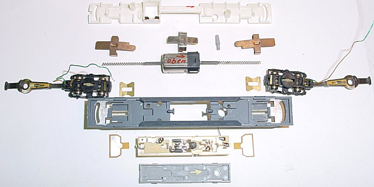 Alle drei Gehäuse abnehmen. Motorwagen nach oben abziehen, Steuerwagen Schrauben der Drehgestelle entfernen. Steuerwagen
