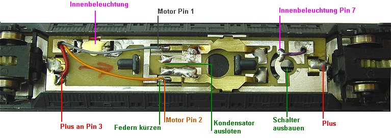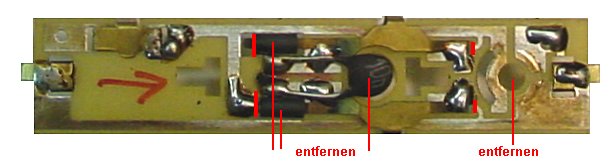 Bei beiden Steuerwagen werden die Diodenplättchen unter den Lampenfedern entfernt, die beiden Litzen für weiß und rot