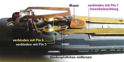 weiß, Pin 6 an Lötstützpunkt Lampe rot, Pin 7 hier weiß, an Lötstützpunkt für Innenbeleuchtung über die grünen Litzen zu