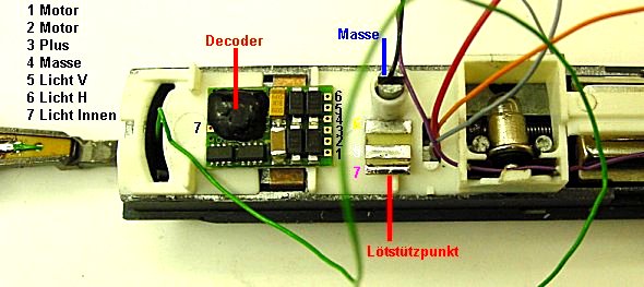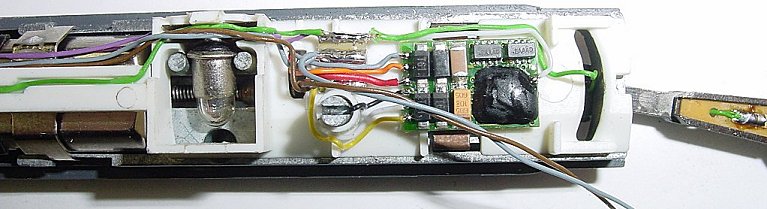 Der Selectrixdecoder ist aufgeklebt, vorher wurde der Untergrund etwas begradigt. Vor dem Metallpin, an dem auch die