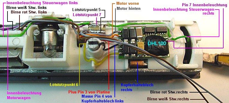 oben verlegt. Lila rechts oben ist an die Innenbeleuchtungsleiterbahn angelötet. Die Birne dafür liegt mit dem Mittelpol