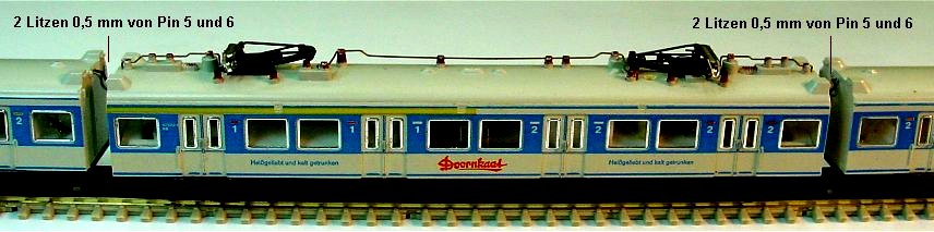 Masse für alle Lampen wird über die Metall-Wagenverbindung übertragen. Die weiß/roten Litzen müssen im hinteren Steuerwagen